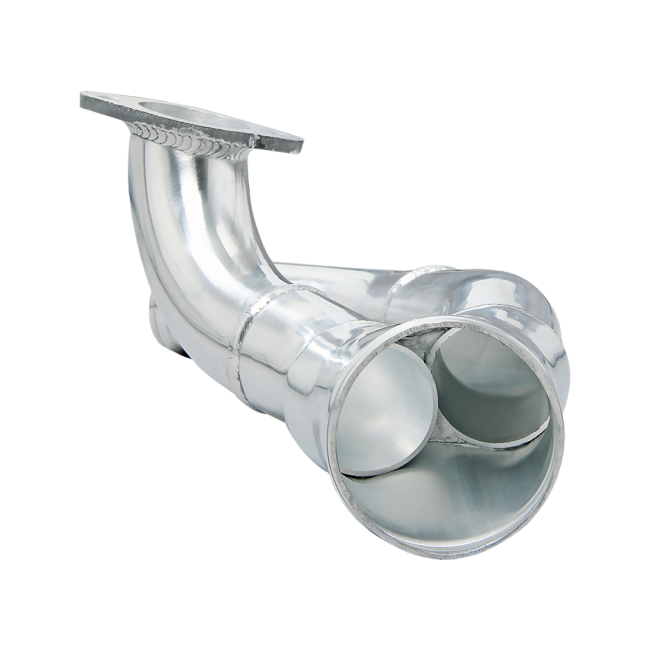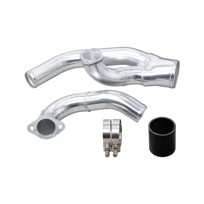 2" Aluminum Pipes with Flanges, Bolt to Turbo Outlets, Merge Into 3" Outlet. It Extends Further Down Along the Engine, Offers Better Connectivity for Aftermarket Intercooler Setup.