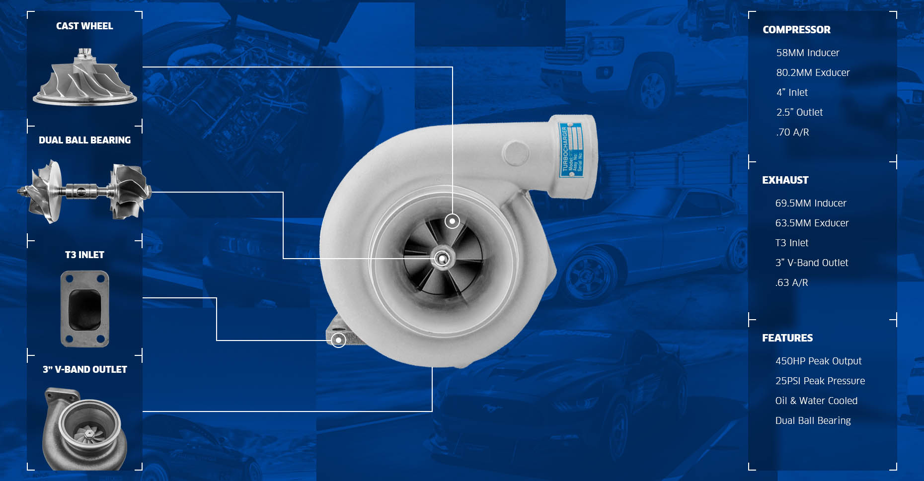 Excellent for Single Turbo Applications for 4 or 6 Cylinder Engines, Such as Honda B16/B18, K20, H22, F22 Engines, Nissan SR20DET, RB20/25, Toyota 1JZ/2JZ, 7MGTE. Also Works for Twin Turbos Applications for GM SBC, LSx, Ford 4.6, 5.0 Engines